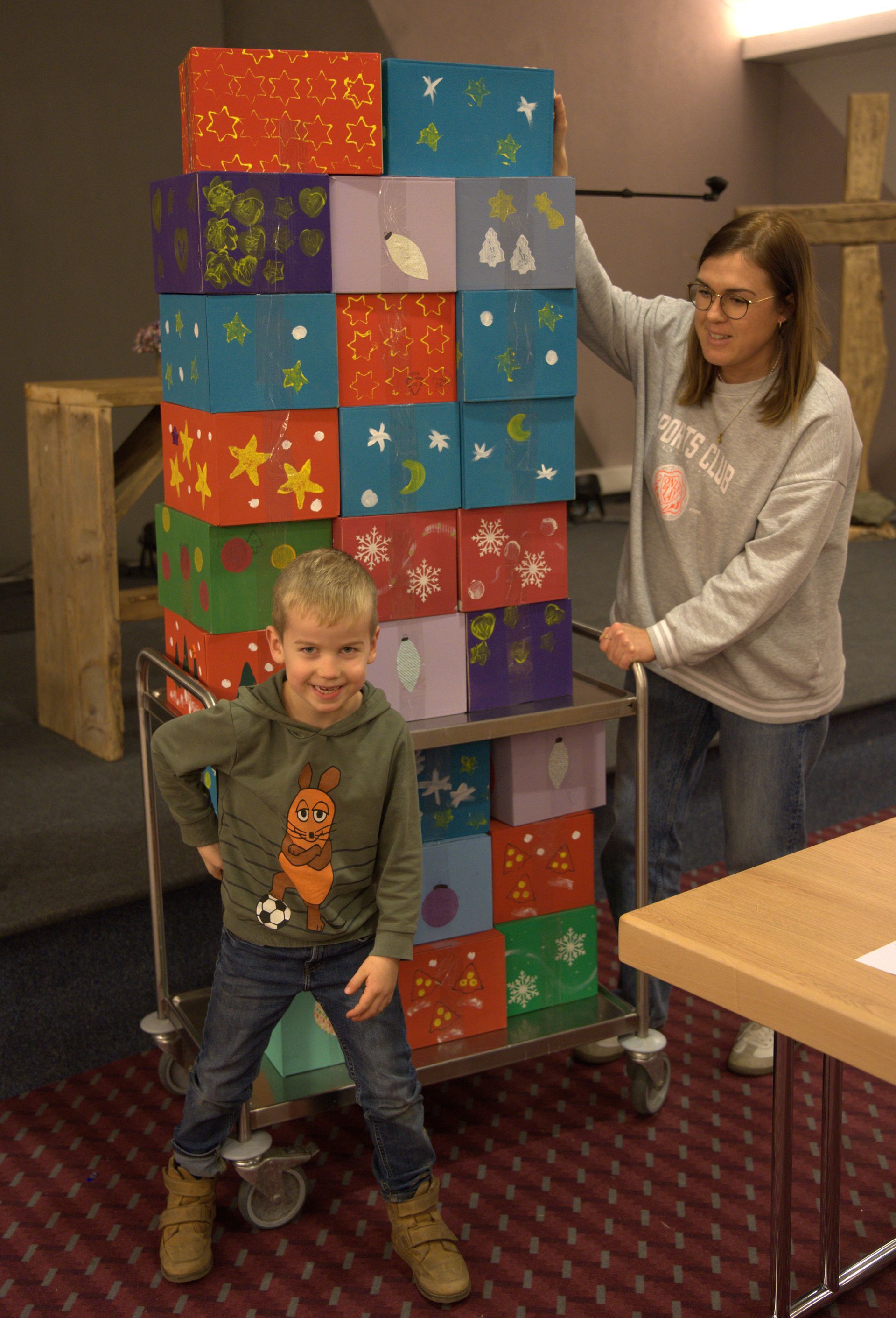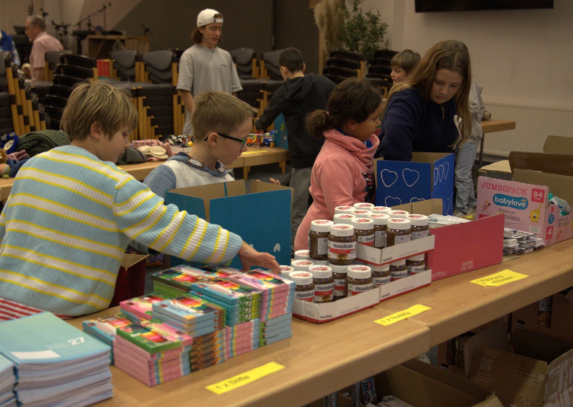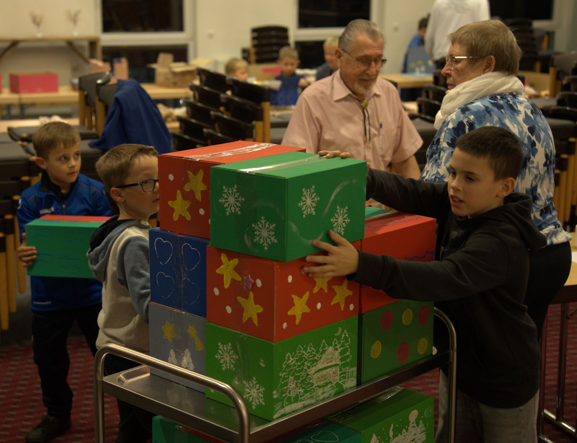 Die Päckchen für dieses Jahr wurden am 20. November in einer fröhlichen Aktion von 30 LöhKids mit der tatkräftigen Unterstützung von 20 Erwachsenen gepackt und aufgestapelt.